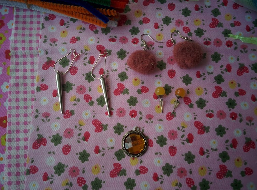 Unas telitas preciosas para hacer un montón de cosas, desde vestiditos para muñecas hasta password (una escusa perfecta para aprender); limpiapias de colores, cintas para decorar o hacer lazos y dos ovillos de lana gruesa en unos colores muy bonitos.