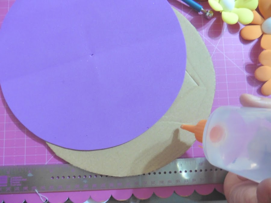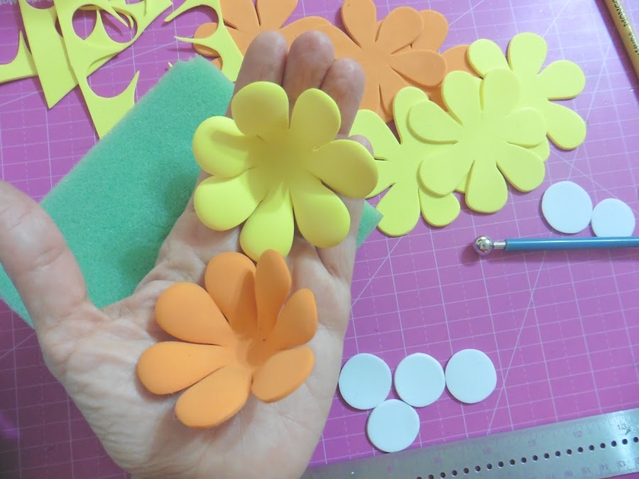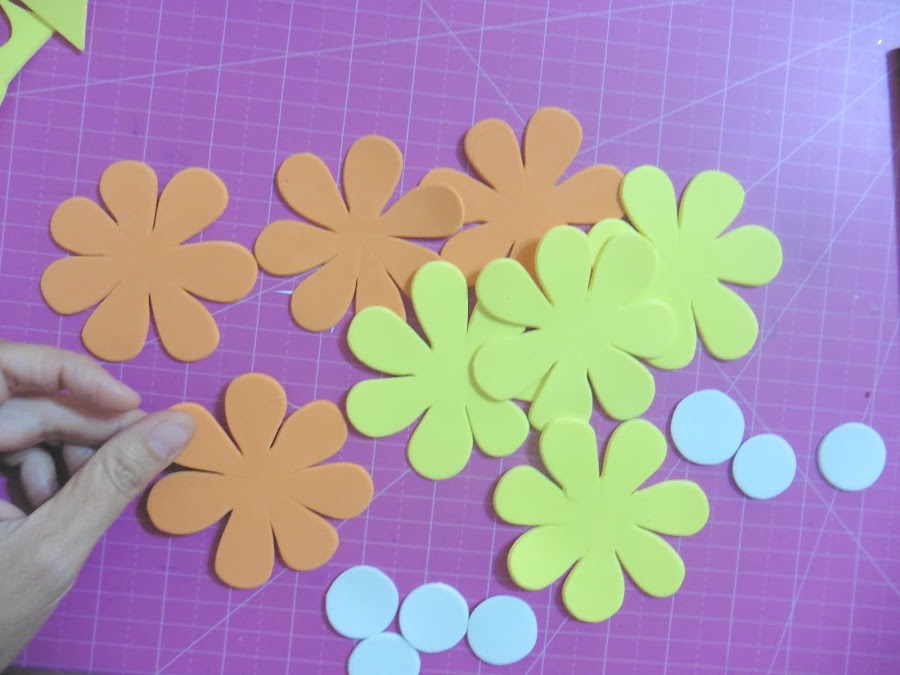 22. Después de armado nuestro reloj, vamos a decorarlo para ello realizamos florecitas naranjas y amarillas y sus centro en micrporoso blanco.