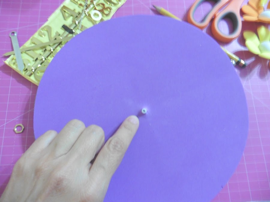 8. A continuación vamos armar el reloj, para ello vamos a cortar un esfera en cartón del mismo diametro de la esfera de microporoso, esto es para darle estabilidad a la hora de poner la maquina del reloj.