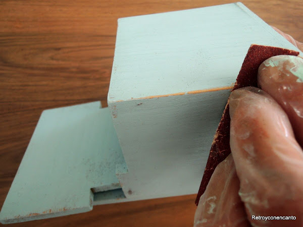 Le dimos una ligera lijada, y lo pintamos con pintura al agua en un suave azul grisáceo. Estamos reutilizando las pinturas que compramos al inicio de nuestra andadura, cuando las de tiza sonaban a algo que nadie sabía muy bien qué eran...