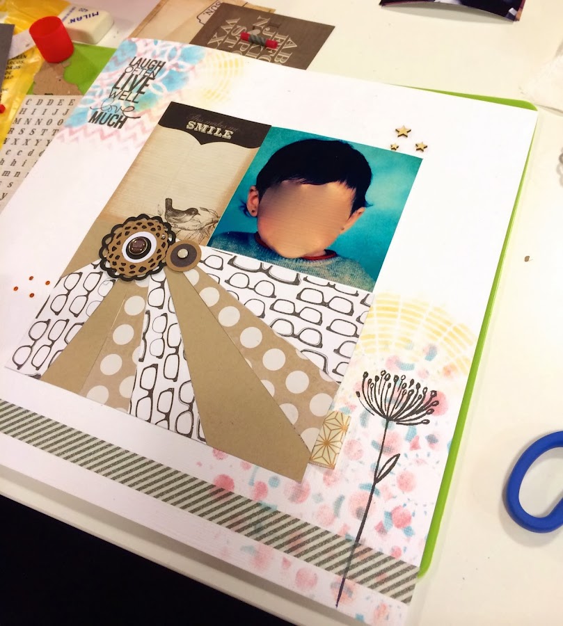 Aprendimos nociones básicas del scrapbooking, de sus materiales y de alguna de sus herramientas, y a continuación nos pusimos a la obra (eso sí bajo un olor....mmm)