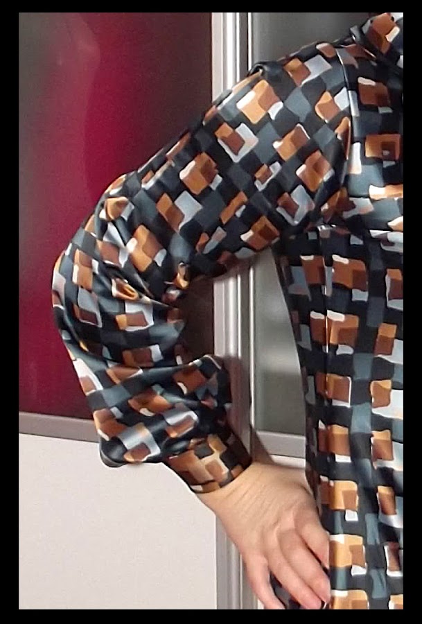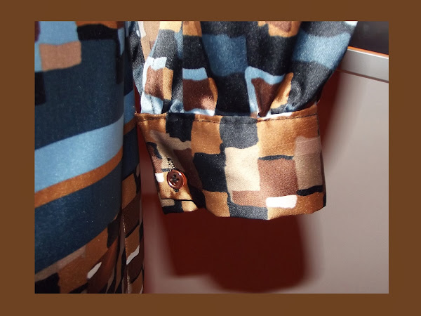 la manga la hice de farol invertida, un poco ajustada en la parte del brazo y afarolada en el antebrazo con el puño estrecho, los ojales los hice a maquina y con unos botoncitos en color cobre hice unos gemelos de forma que se viese el botón por los dos lados: