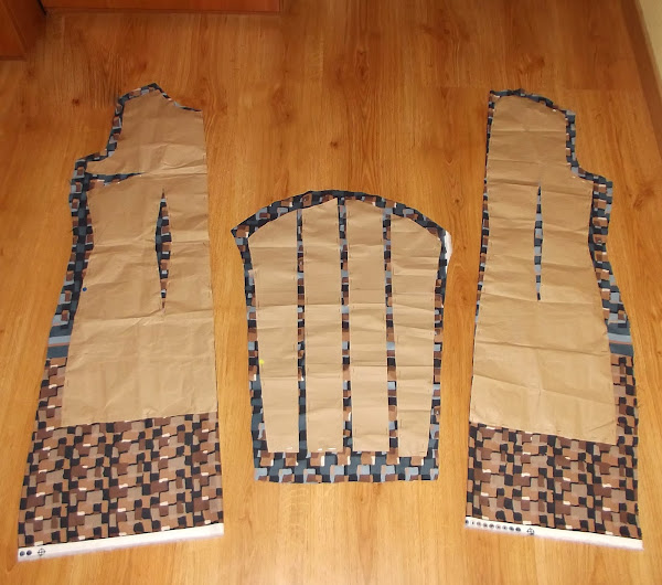 En fin, que mientras estaba esperando en la caja para pagar la vi expuesta en la sección de novedades y nada mas verla se dibujo una idea en mi cabeza, me acerque a tocarla y ya no puede resistirme era un raso piel de ángel muy agradable al tacto, y por ultimo y lo mas importante el precio, por muy maravillosa que fuese la tela si no se adaptaba a mi bolsillo ahí se quedaría para ser admirada y nada mas, pero hubo suerte y no era cara así que compre lo necesario para un vestido de manga larga por encima de la rodilla, con pinzas traseras, y en el delantero únicamente pinza lateral y hombro trasladada al lateral, os dejo foto de los patrones colocados: