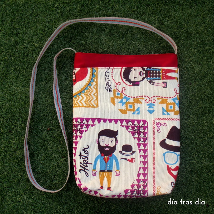 Hace algún tiempo vi una tela que me gustó a primera vista, con un estampado de temática hipster. Y como me pareció muy original, la compré pensando en hacer en algún momento un bolso con ella. En cuanto la tuve en mis manos me pareció perfecta para hacer un bolso para Sara como regalo de Reyes.