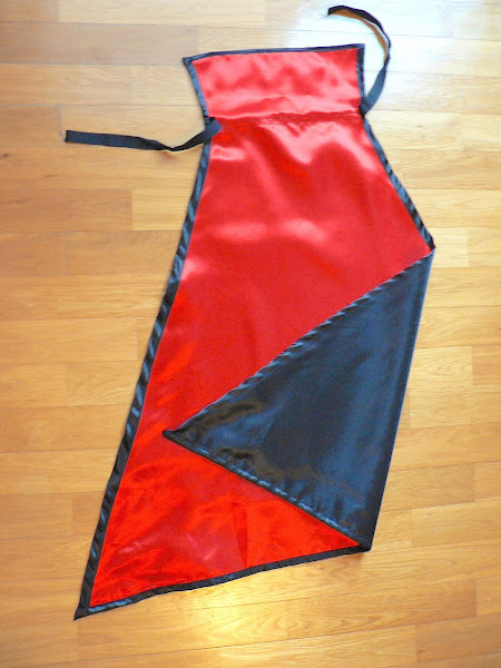 El fajín no es más que un círculo de tela de camiseta roja. La capa también la diseñé yo. Le puse entretela dura en la parte de arriba para que le quedara el cuello muy armado. En lugar de usar la típica tela de disfraz, usé una un poco más dura para que la capa tuviera mucho cuerpo. Además la hice doble, negra por fuera y roja por dentro. No había quien se la quitara!!