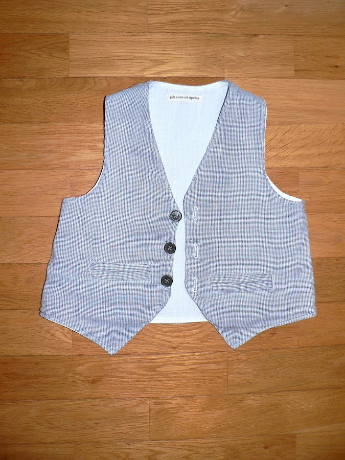 El chaleco ya lo tenía, se lo hice en primavera para asistir a una boda de la familia. El patrón es propio. La tela ha sido un completo fallo. Muy mala de coser, se mueve montón y se arruga con sólo mirarla. Además fue la primera vez que hacía este tipo de bolsillos y me quedaron un churro entre la falta de práctica y la tela horrorosa. Pero él encantado con su chaleco, vamos!