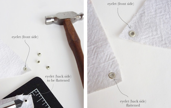 Coloca los ojales en las esquinas de las dos velas. Corta una pequeña rendija cerca de la esquina, empuja la parte posterior del ojal, y siguiendo las instrucciones del fabricante, fija la pieza. Golpea con firmeza el ojal directamente entre dos y tres veces con el martillo para aplanar los lados hacia abajo alrededor de la tela.