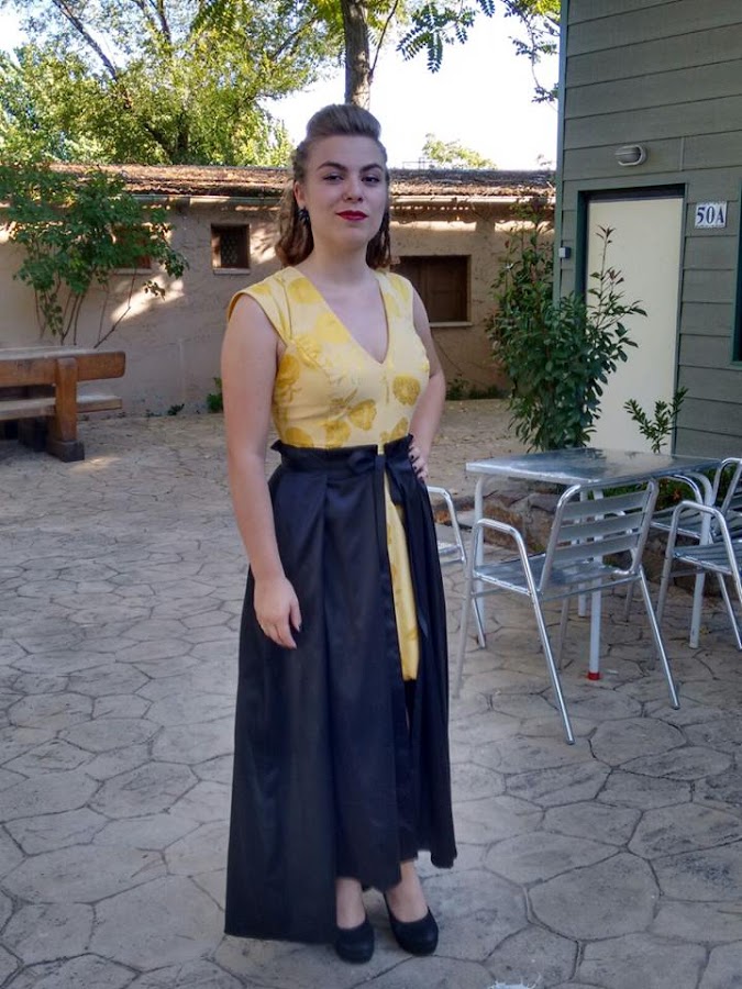 Tampoco tengo ninguna foto de la sobrefalda , lleva la misma forma con largo desigual que el vestido , y estaba pensada para que sirviera de capa por la noche