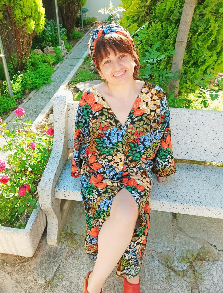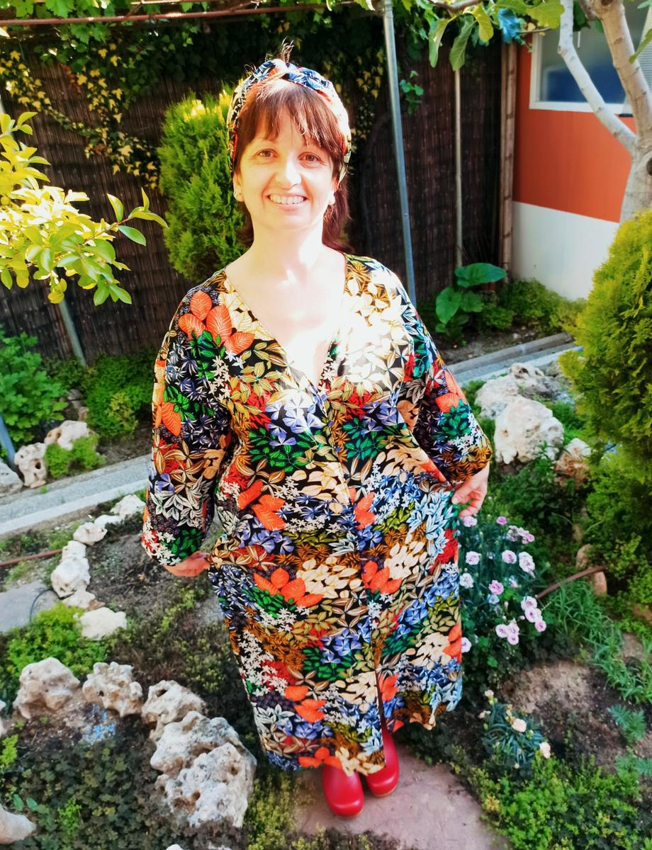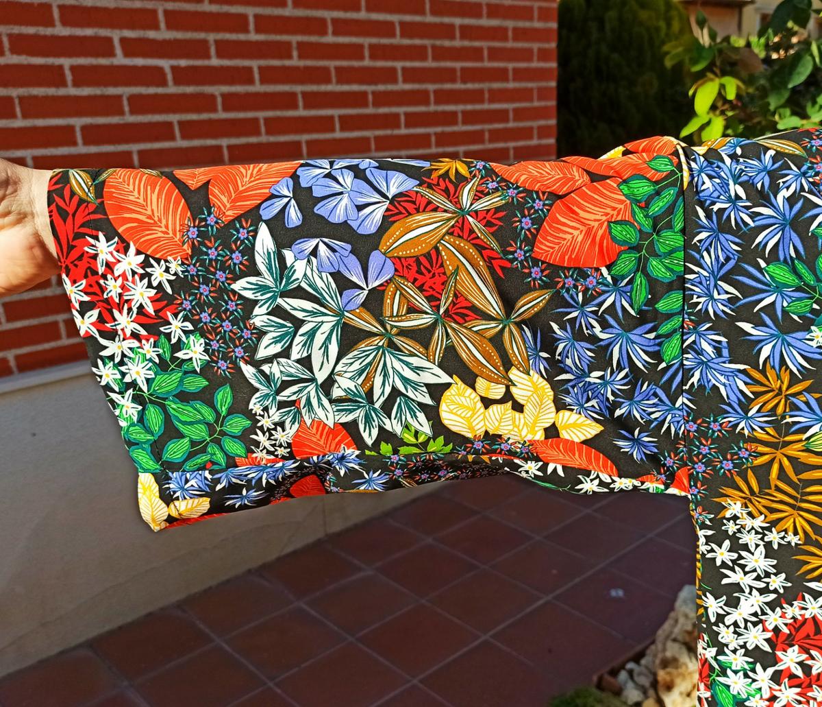 Es una prenda diseñada por mi con mucho cariño y mucho respeto; y si me conocéis de hace tiempo, vais a ver en ella muchas de las cosas que me inspiran cuando creo algo propio.Los colores y el brillo de las telas africanas, las flores y los elementos botánicos, el corte de las túnicas, el estilo de los kimonos japoneses que tanto me gustan y un cierto toque retro de la moda de los años 70.
