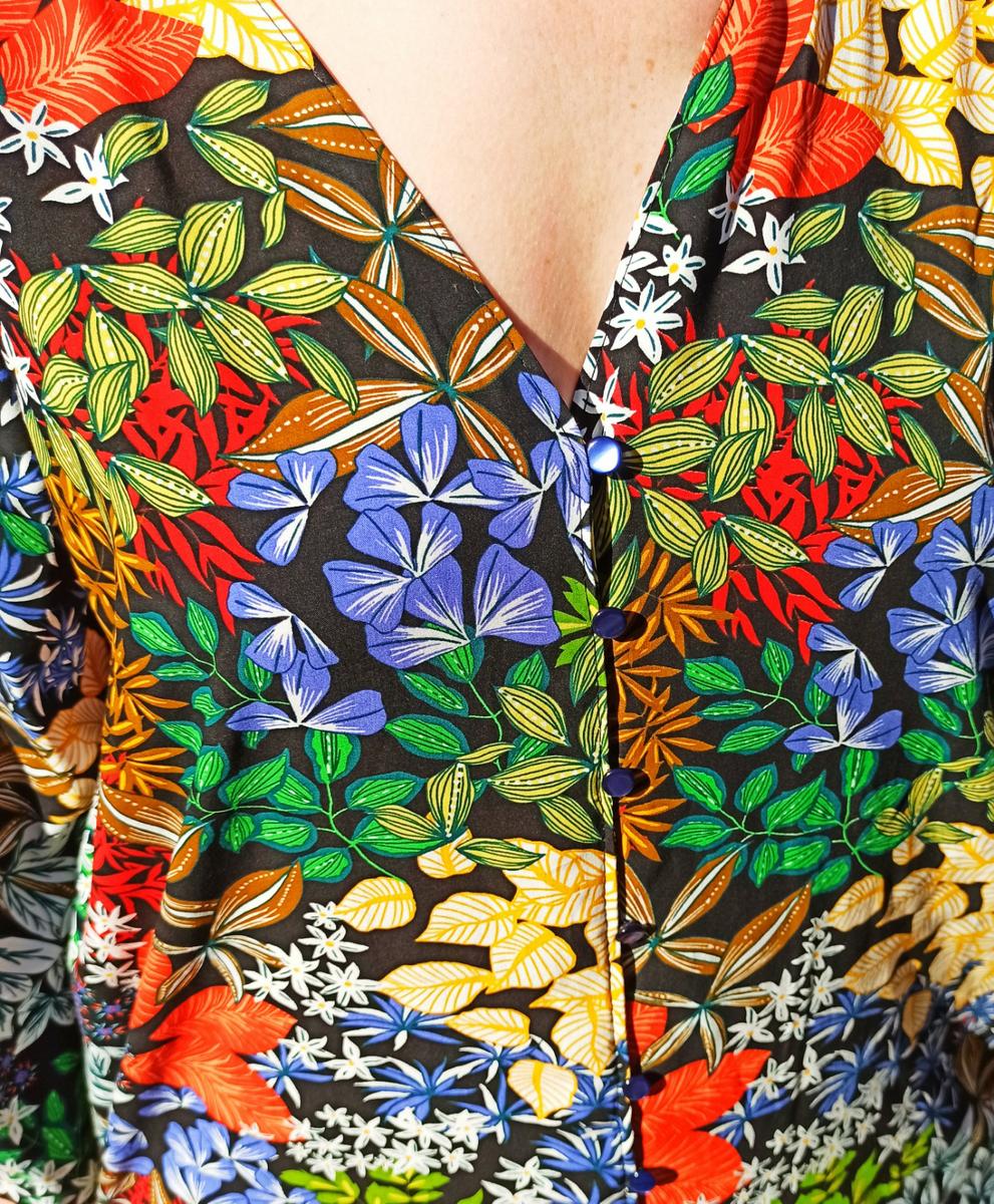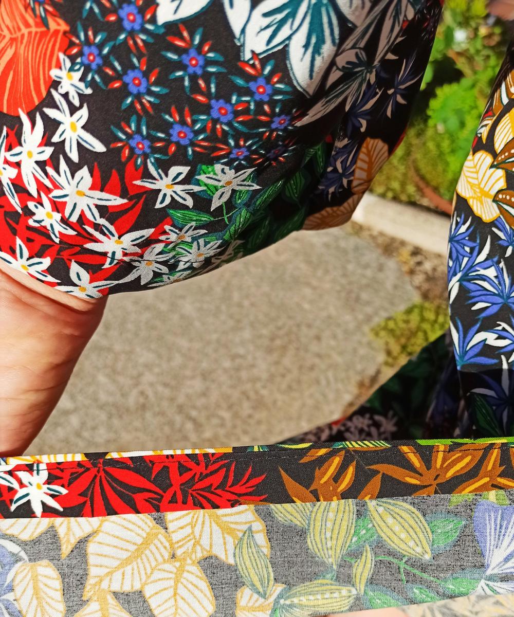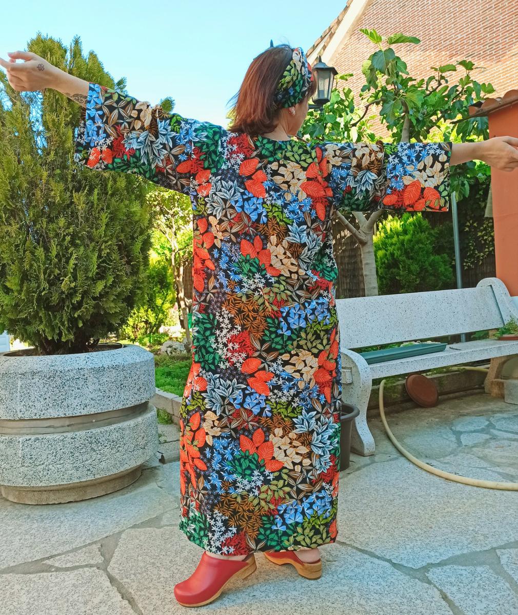 Es una prenda diseñada por mi con mucho cariño y mucho respeto; y si me conocéis de hace tiempo, vais a ver en ella muchas de las cosas que me inspiran cuando creo algo propio.Los colores y el brillo de las telas africanas, las flores y los elementos botánicos, el corte de las túnicas, el estilo de los kimonos japoneses que tanto me gustan y un cierto toque retro de la moda de los años 70.