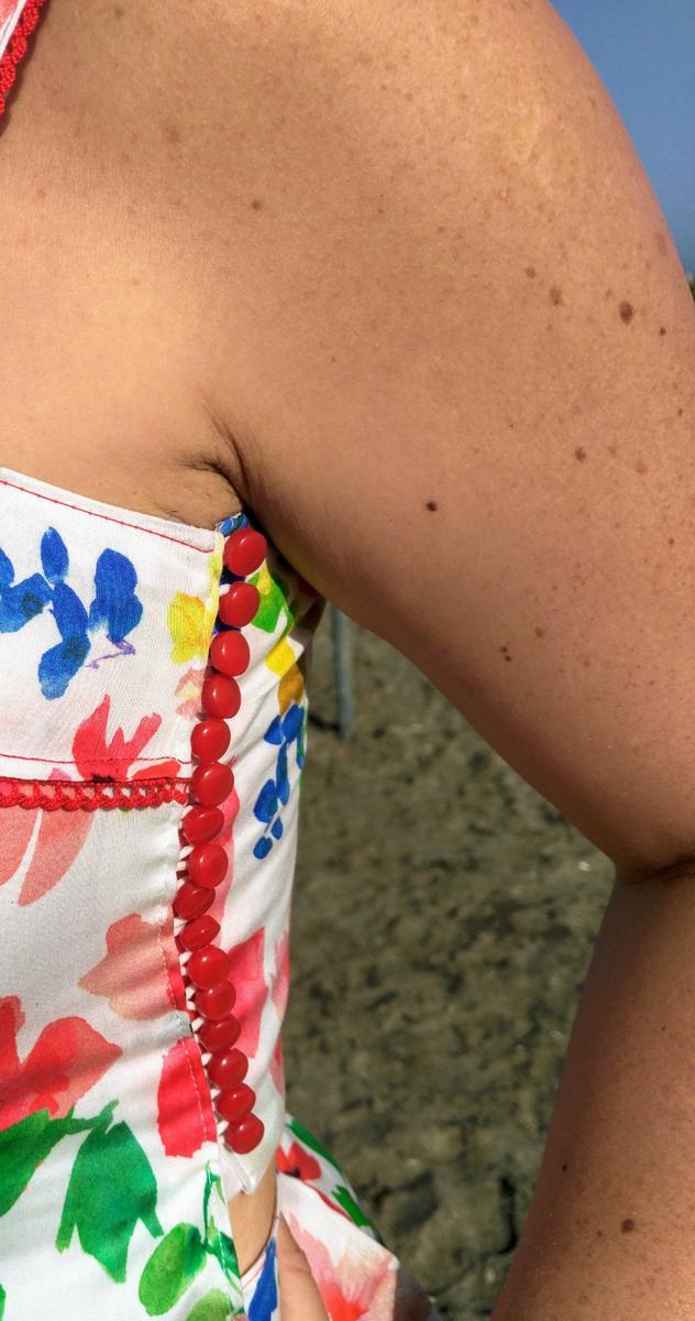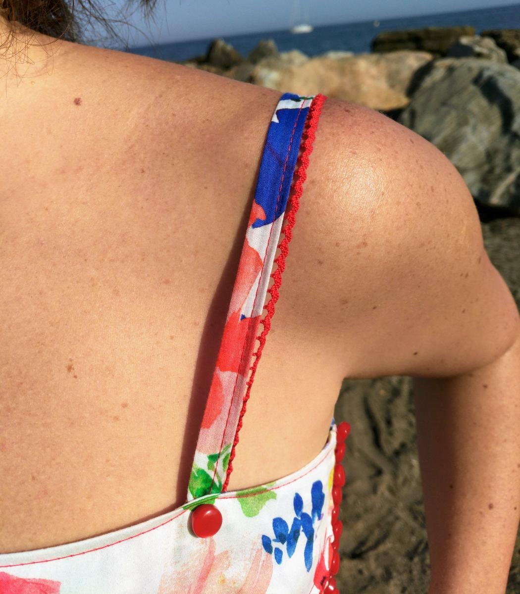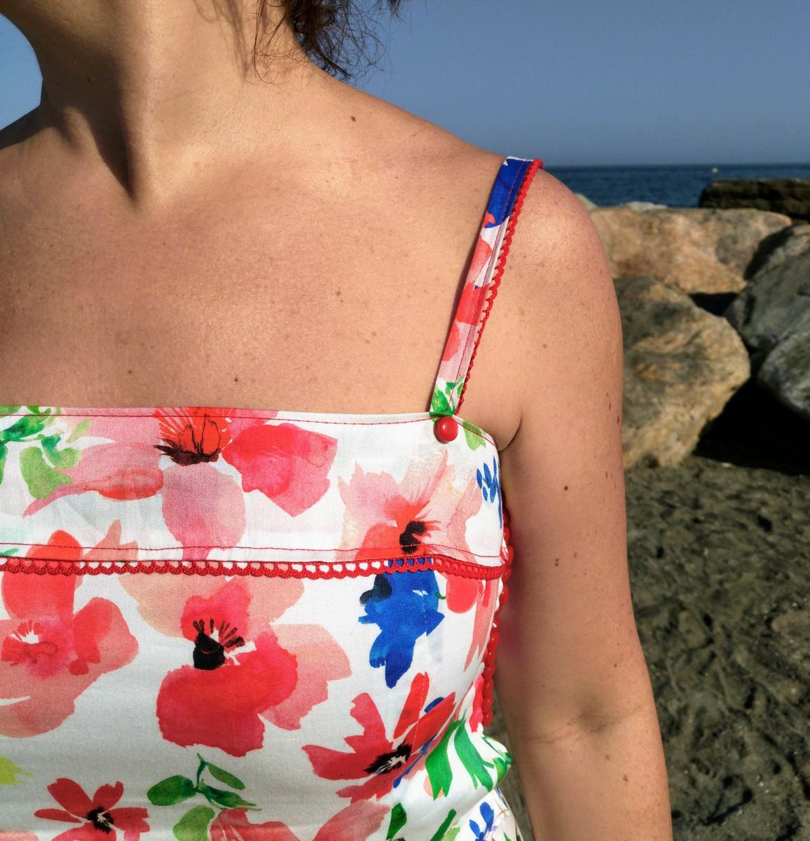 Lo primero que he cambiado son los tirantes, que en esta ocasión, además de ser más finos, no son cruzados y llevan un pequeño botón en el delantero.