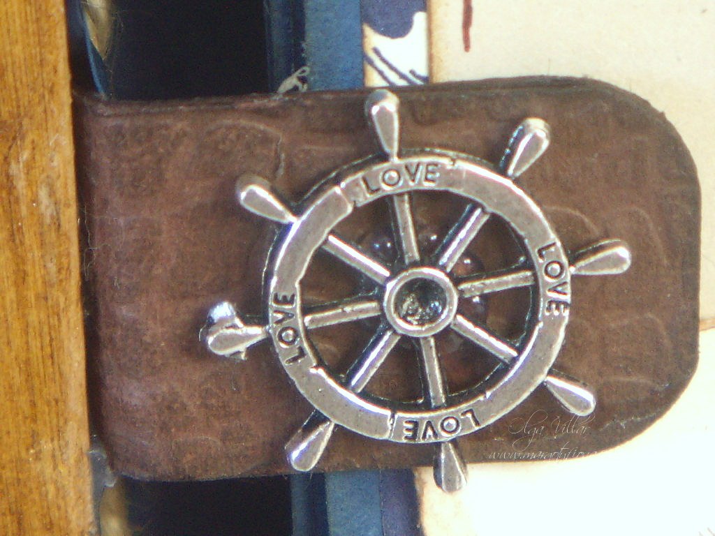 El cierre del cuaderno está hecho con papel simulando piel y un charm de timón en plateado. este lleva una plaquita metálica en su interior que permite doblarlo o estirarlo para poder abrir el cuaderno.