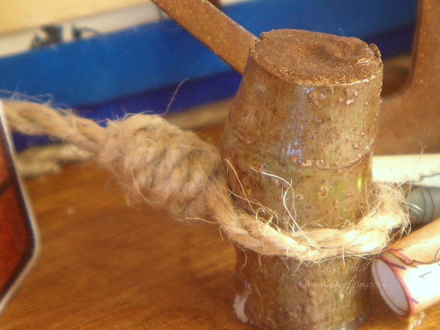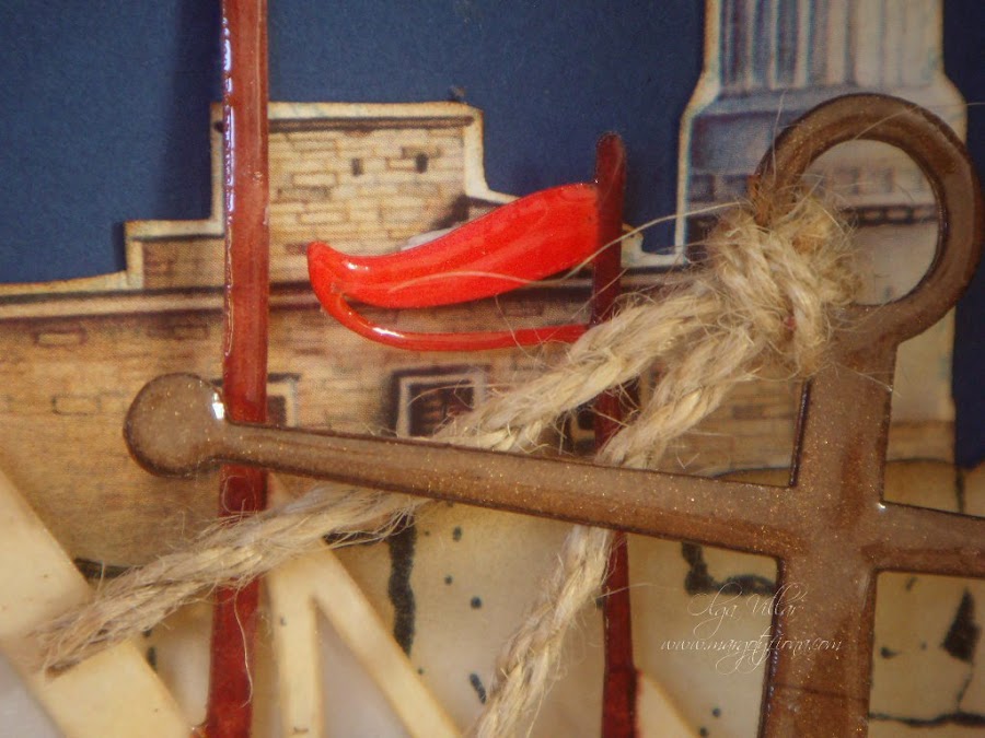 Tinte madera, Goma laca, cordel de fibras naturales, ramita de madera de higuera, piedras de jardinería, papeles de diferentes colecciones de G. Tassotti, papeles de Decoupage, carta náutica de costa norte de España, Twine en color rojo y azul, polvos de embosing en color transparente y rojo, diferentes cintas, charm de ancla, sello de textura Rocks de Kaisercraft, y mucho mucho cariño.