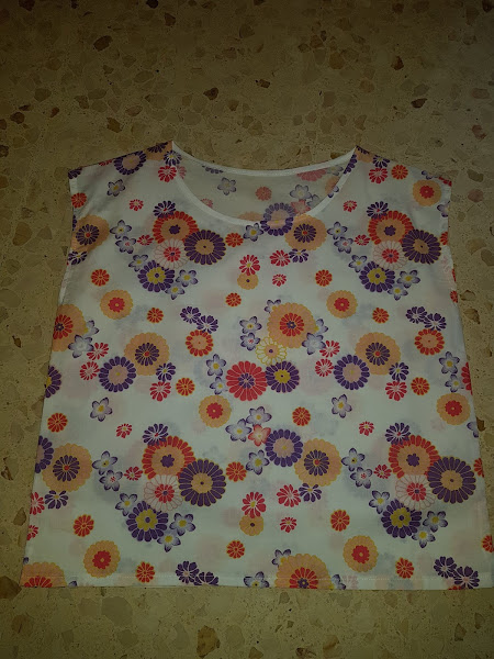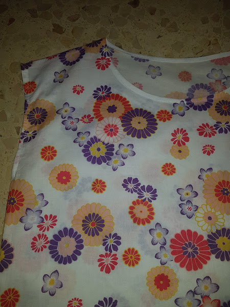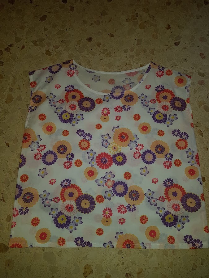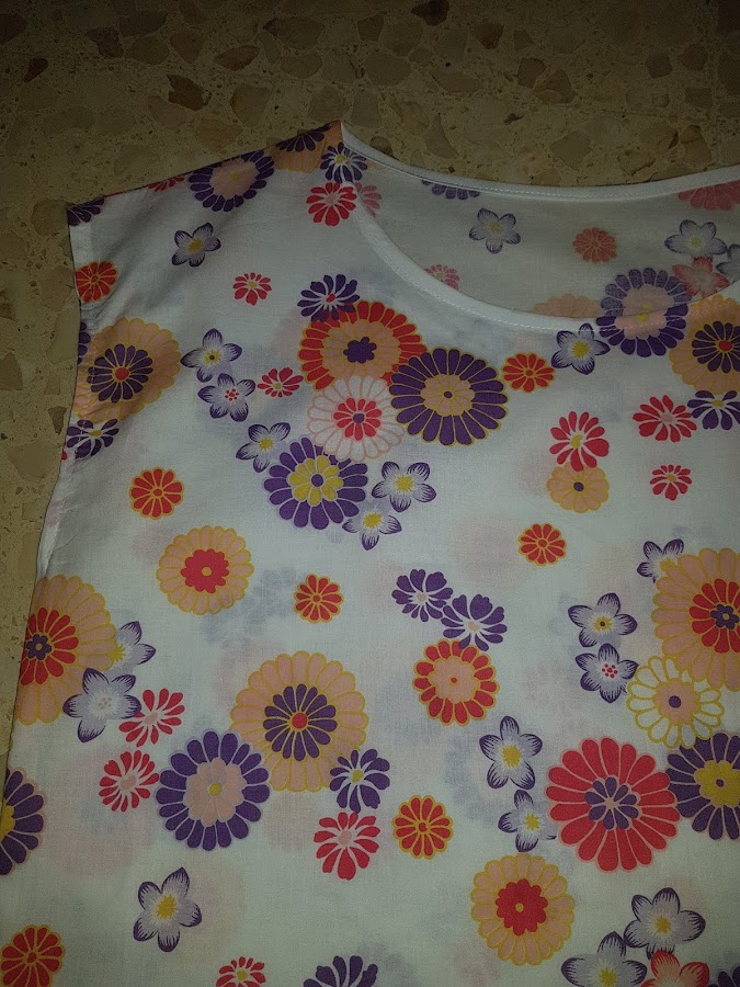 El cuello lo he rematado con cinta al bies de algodon de color blanco y las mangas con un simple dobladillo.