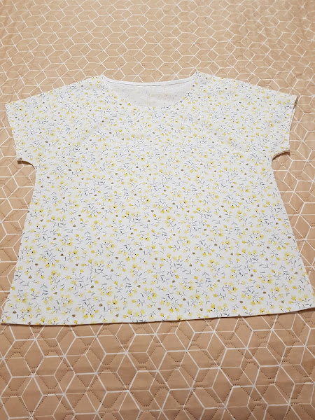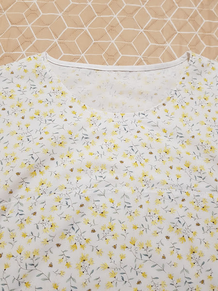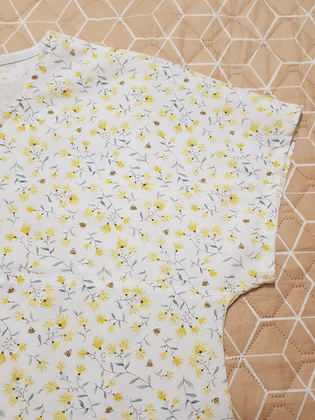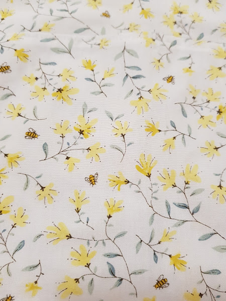 En esta foto se puede ver lo bonito que es el estampado de la tela , florecitas amarillas sobre fondo de color blanco salpicado de abejitas muy pequeñitas que vuelan alrededor de las florecitas.