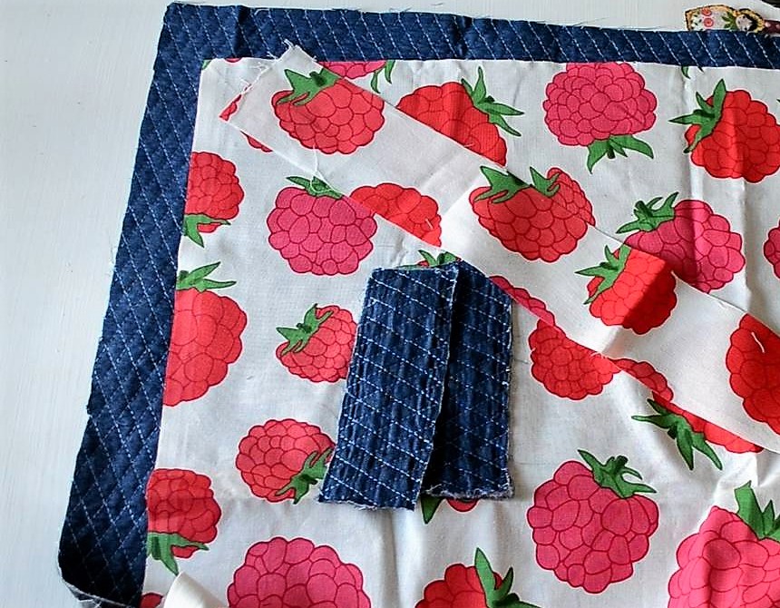 Dos cuadrados de 60 x60 cm. Uno de tela vaquera y otro de tela de frambuesas