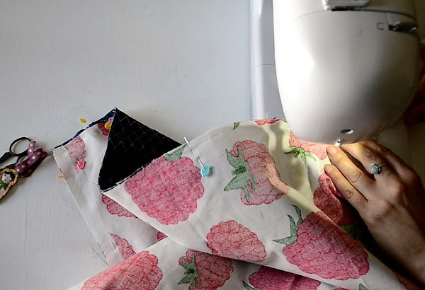 Y ahora pondremos la de frambuesas encima, con el derecho hacia dentro y damos un pespunte por el revés de las telas todo alrededor del cuadrado, excepto unos 7-10 cm que dejamos sin coser en el centro de uno de los laterales del cuadrado.