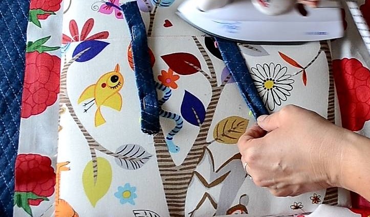 Una vez cortadas lo que hacemos es con las tiras, tanto la de 62 cm como las dos en vaquero de 15, las doblamos los dos extremos hacia adentro y luego por la mitad, planchamos bien y damos un pespunte con la maquina.