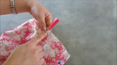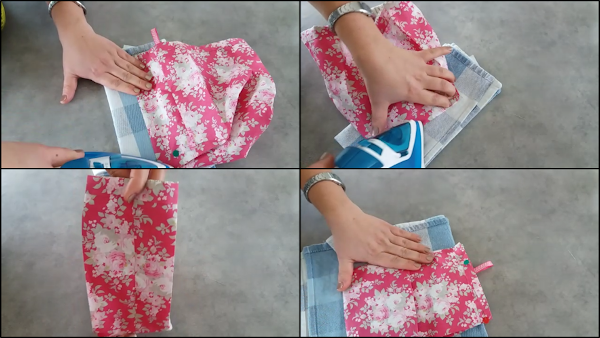 Cortadas las telas, las vamos a doblar por la mitad, y vamos a pasar una puntada recta por lo lados de 22 cm, de esta manera: