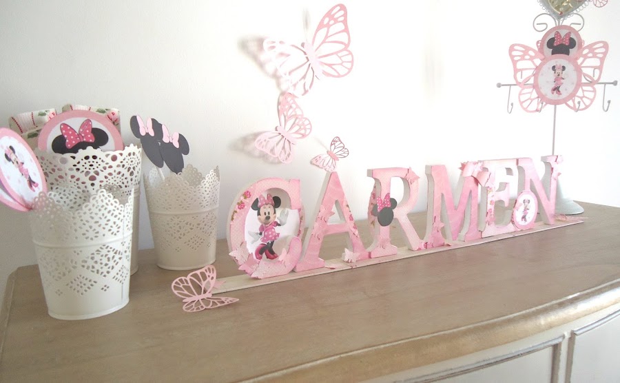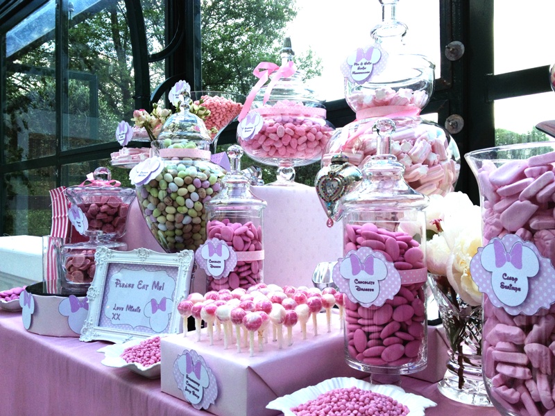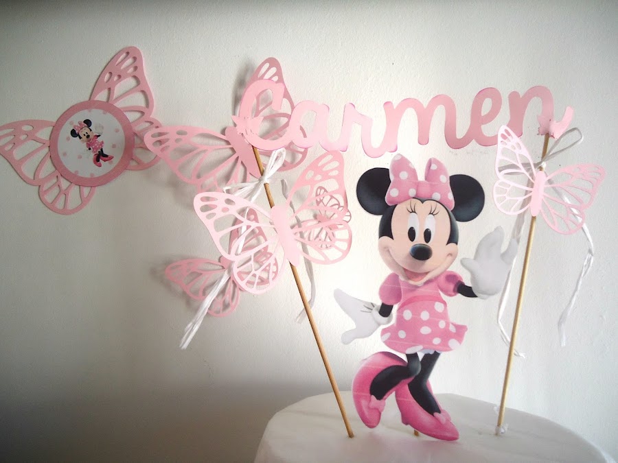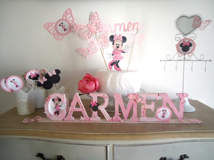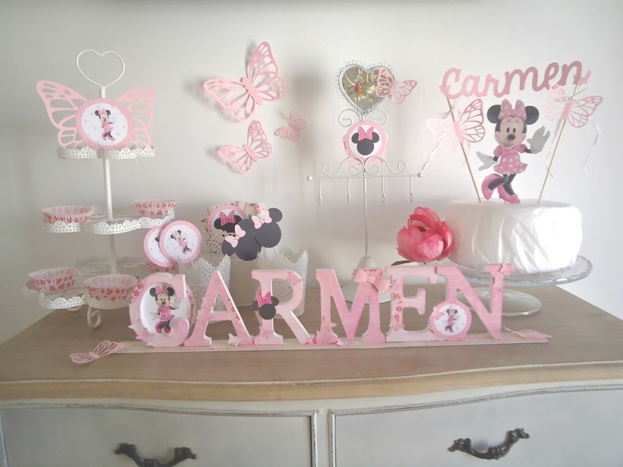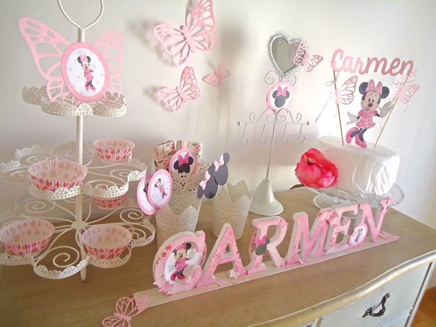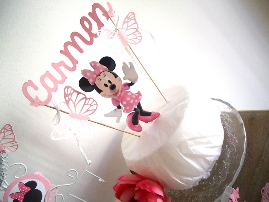 Como protagonista nuestra querida Minnie, una rica tarta cubierta de nata, chocolate blanco o merengue, un divertido topper personalizado con su kit a juego... gominolas y unos sándwiches y en una tarde tienes montada la mesa con la que soñaría cualquier pequeña.