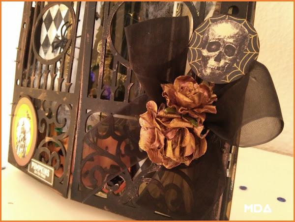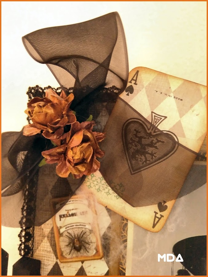 En cuanto a la decoración y como podéis ver, he usado cinta de organza en negro, flores de Prima pintadas con acrílico metalizado, stickers, puntilla...