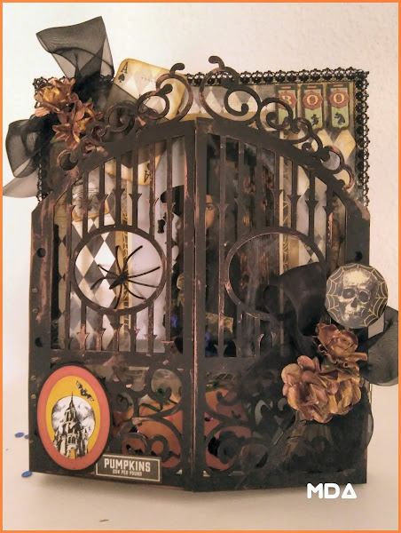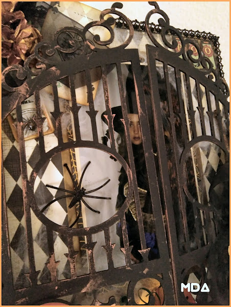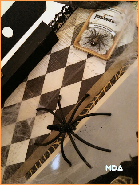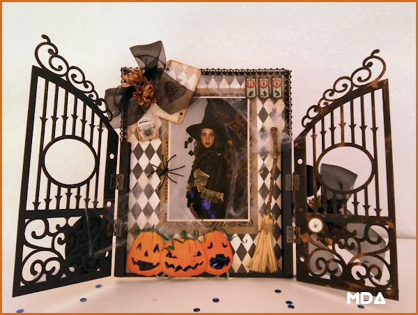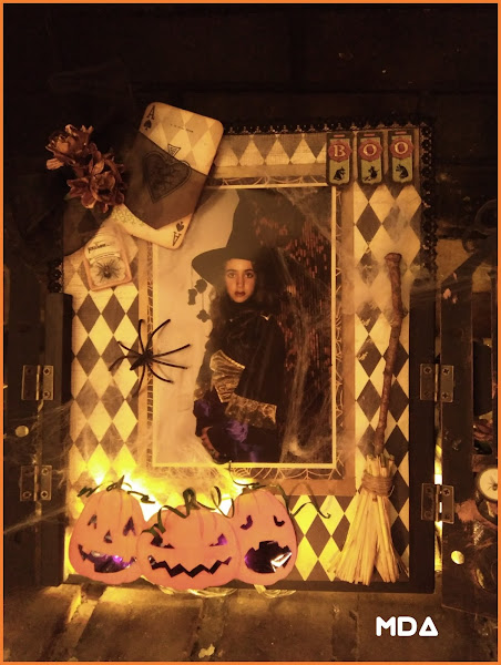 Usé como fondo un papel de Carta Bella al que he entintado y alterado con distress. La fotografía está pegada con cinta doble cara de relieve sobre papeles de la colección de Bo Bunny "Wonderfully Wicked" además de washi en oro viejo, todo a modo de marco.