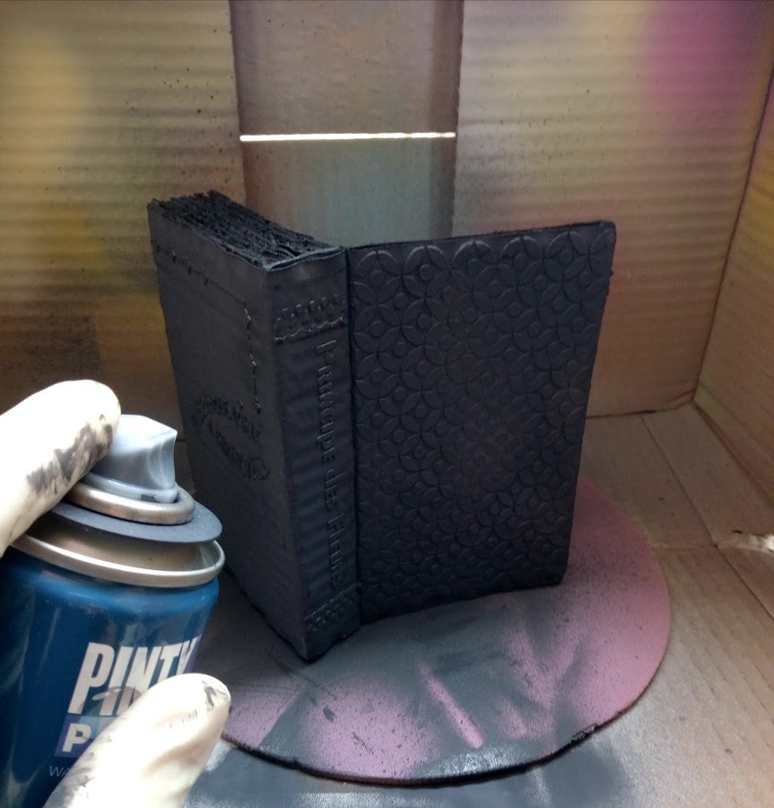 Para este tipo de trabajo es muy cómodo utilizar los spray porque pintamos todo en poco tiempo y con el mínimo esfuerzo, rápidamente, sin dejar "recovecos". Este tipo de pintura son al agua, muy cubrientes y además secan muy rápidamente por lo que no deforman el cartón ni el papel.
