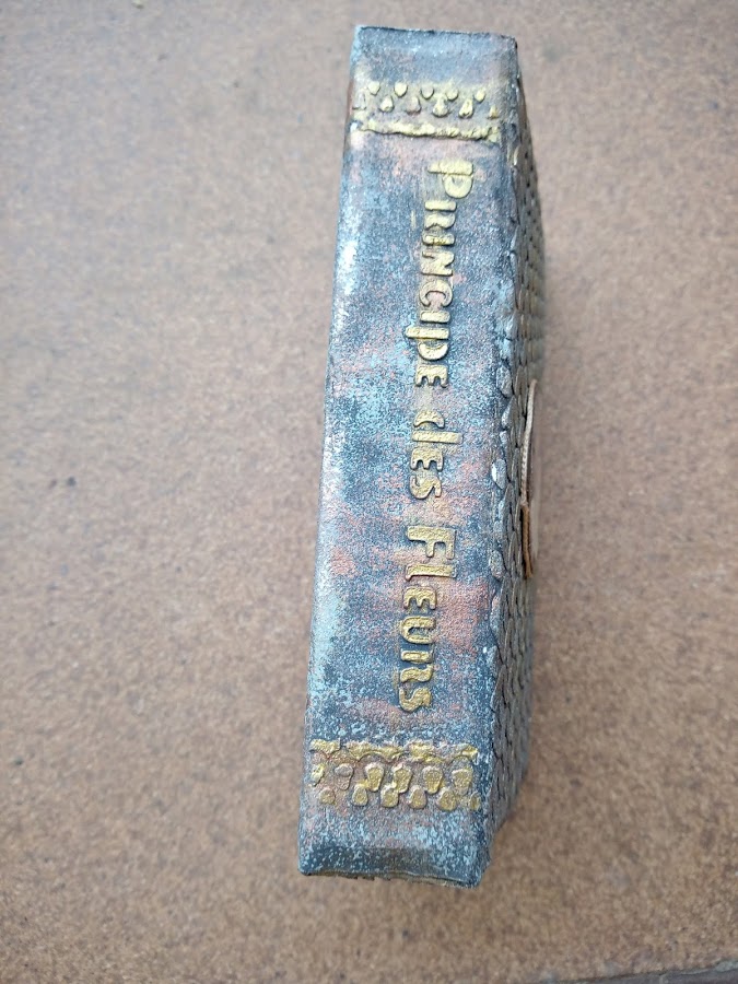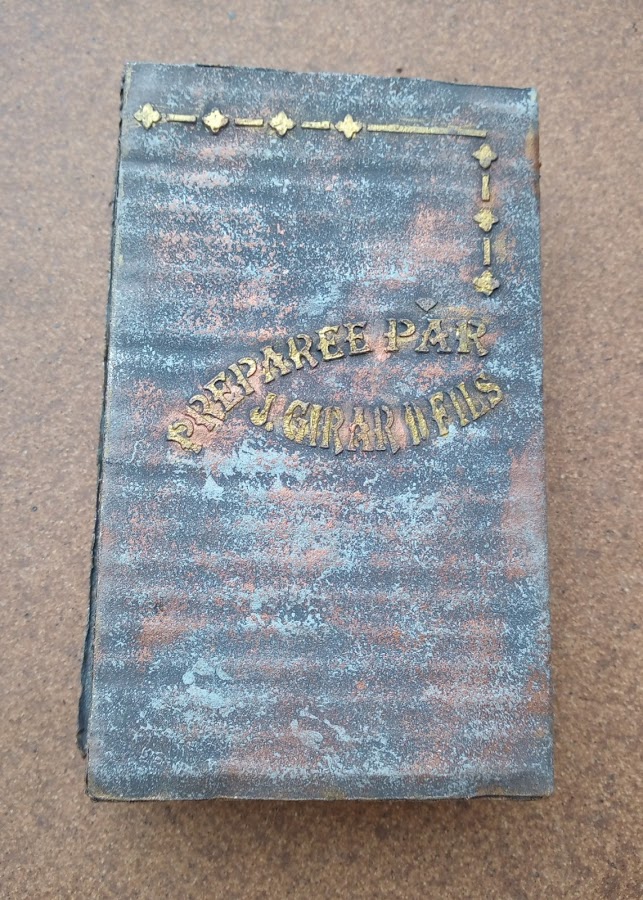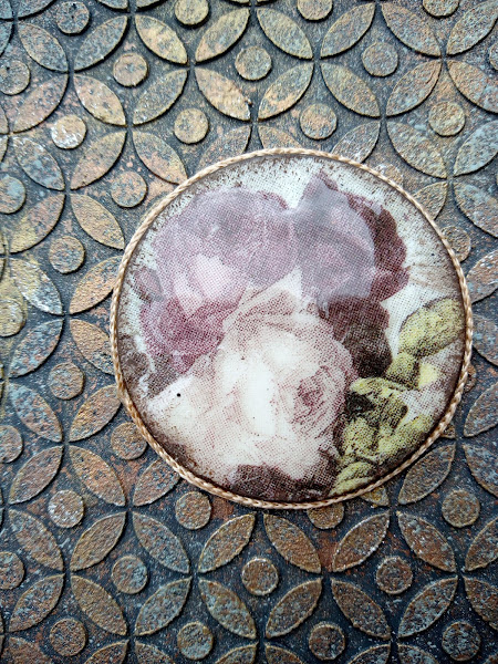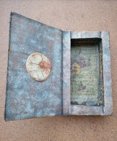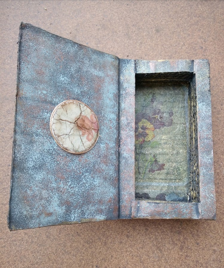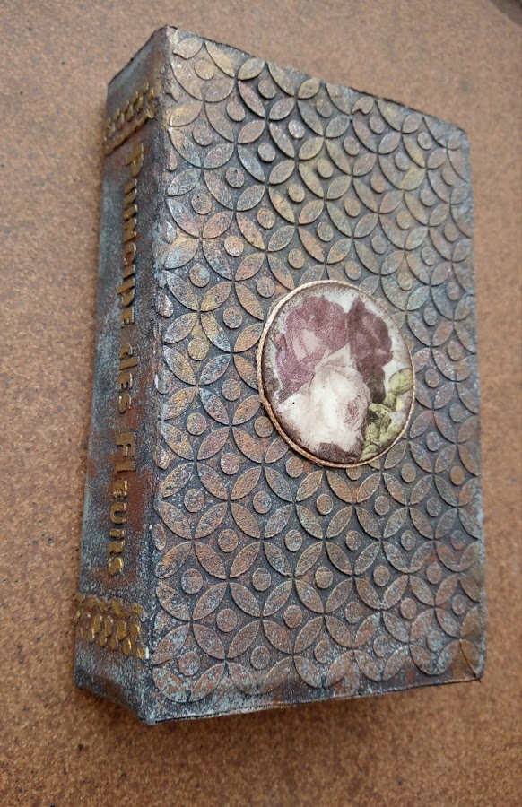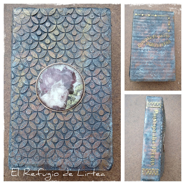 Yo me he permitido la licencia en lugar de buscar un papel para la portada del libro como nos enseñaba el tutorial, la he realizado con pasta y stencil y he utilizado pinturas y pátinas para dar este aspecto de libro antiguo que veis en el trabajo, pero he seguido todos los pasos que Vero nos explica para hacer esta caja libro.