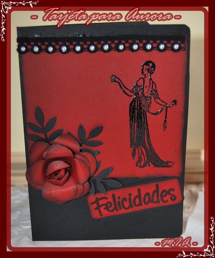 La tarjeta en la misma línea... sello Hampton Art Cling Vintage Ladies, embosado con polvos negros, un encaje negro con perlitas blancas y de nuevo rosa casera. El letrero de "Felicidades" de Mensajes en Español de Stampendous estampado con tinta versafine negra.