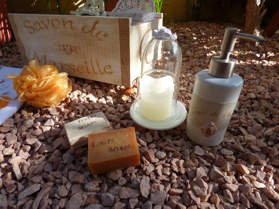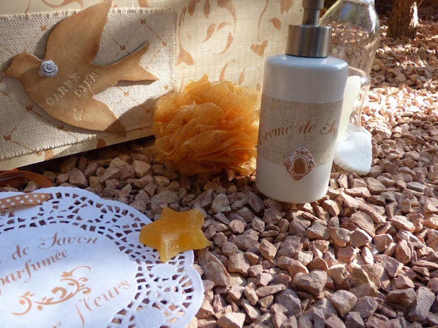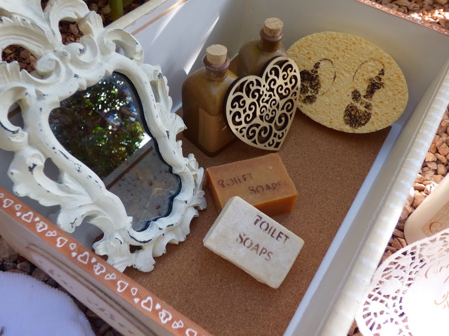 Tampoco se han librado de un detallito estarcido, las pastillas de jabón ecológico, una de miel y la otra de vainilla....se me está yendo un poco la cabeza ¿¿no?? jaja