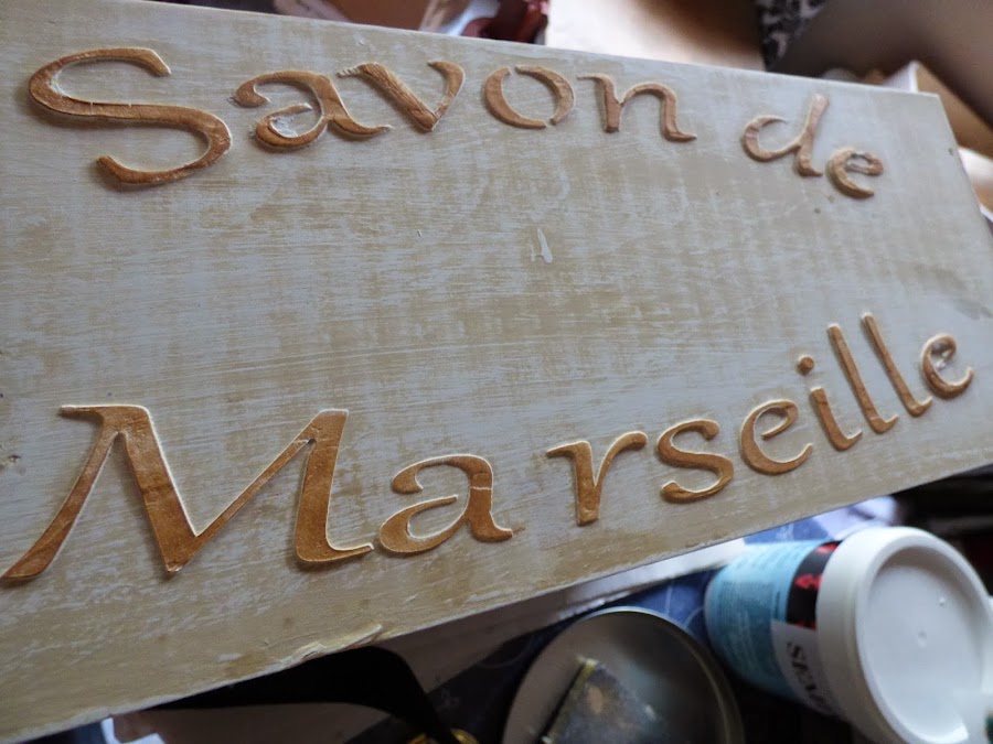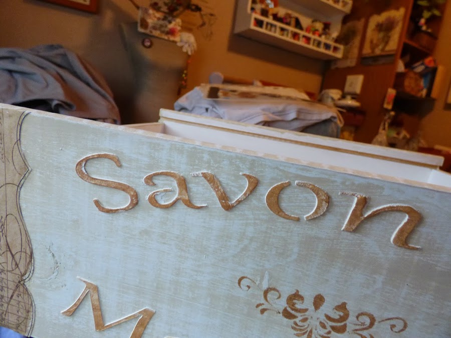 El dosificador de jabón es el que tengo en el baño. Lleva un retal de papel pintado de paredes, con estarcido y pegado con cola....ademas le he puesto una figurita de yeso tambien