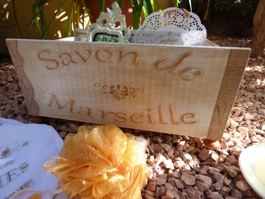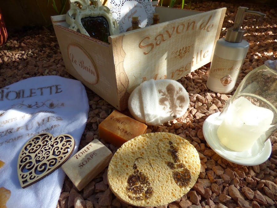 Y en mi locura de estarcir cualquier cosa, he probado con las esponjas, la amarillita con unos botes de perfume y a la blanca con asa le he puesto una flor de Lis......ya os contaré qué pasa con los estarcidos en las esponjas cuando me meta en la ducha con ellas jaja
