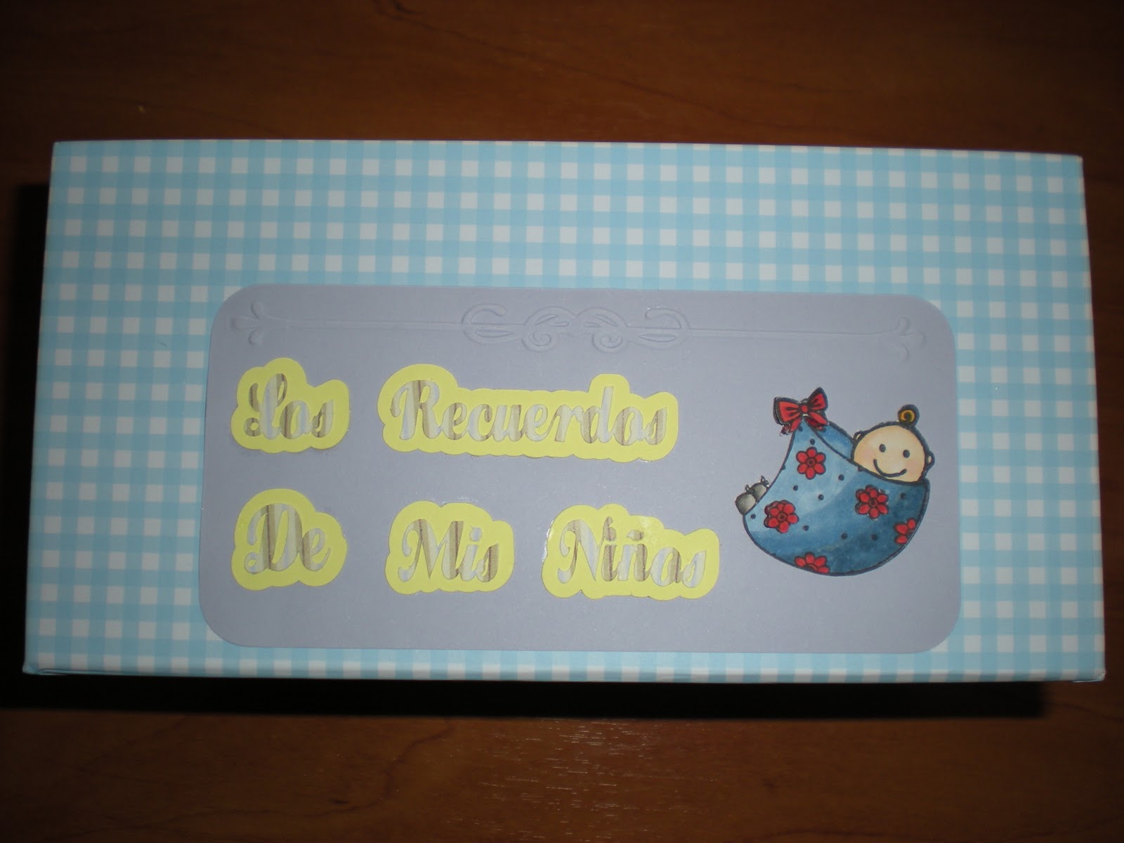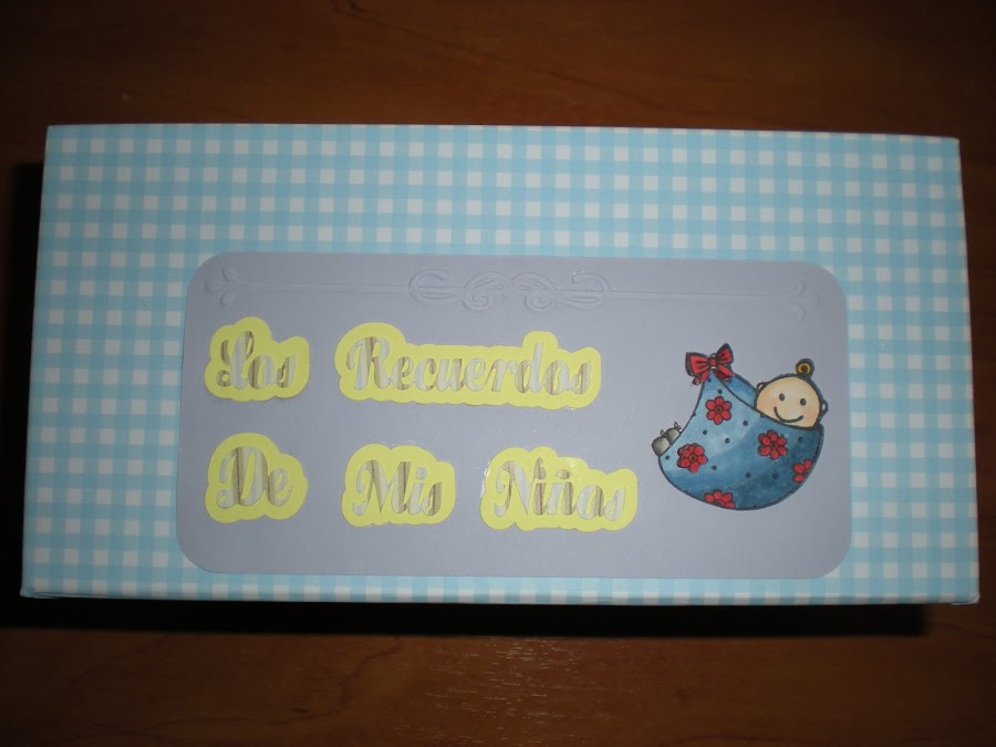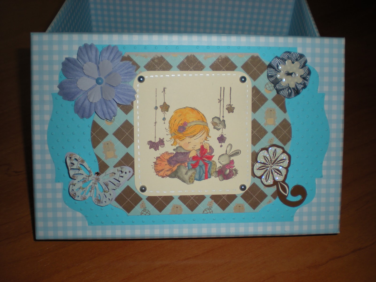 Esta es la tapadera : consta de un papel embosado dando relieve de dots un lindo papel de topitos y una estampación pintada con copics la estampación la he pespunteado con lineas y en las esquinas hay una perlita.
