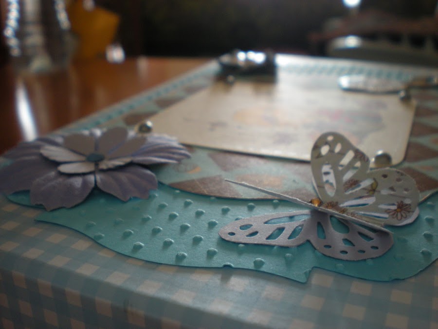 Desde esta toma , se puede observar una mariposa en tonos azules y con un brillantito por cabeza y una flor doble también en tonos azules, también se aprecian los dots del papel embosado.