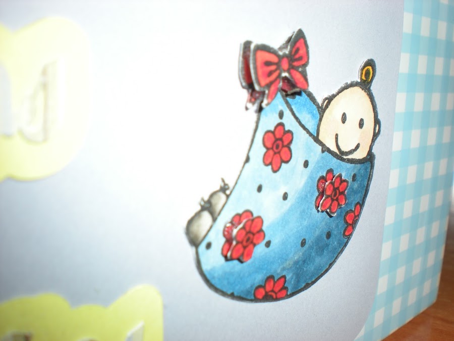 Un detalle del bebe, se trata de una estampación coloreada con copics y con relieve del lazo y de dos de las flores .