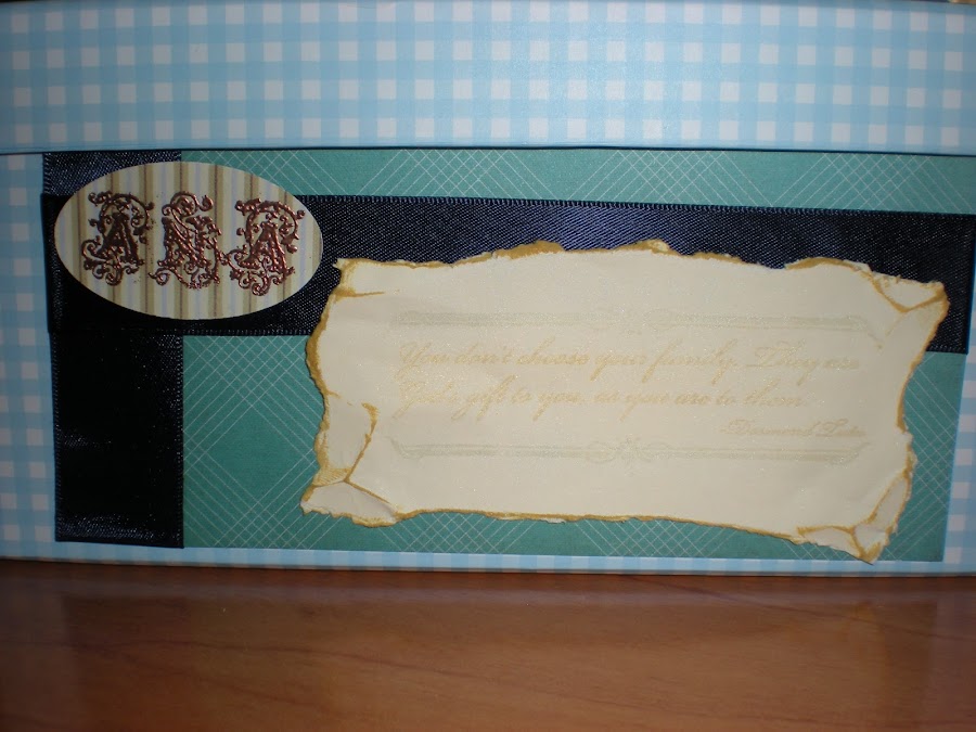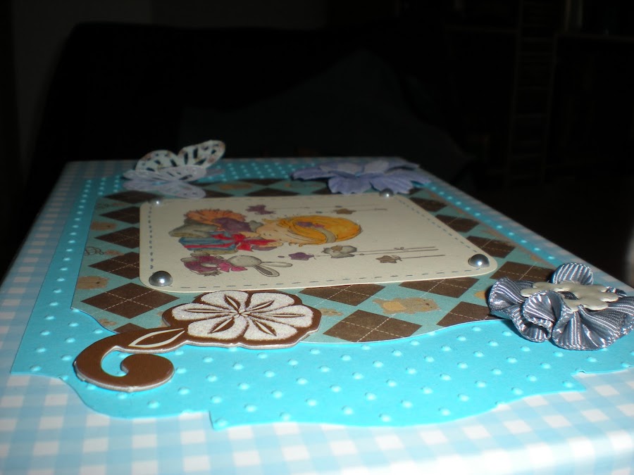 Este es otro lateral , en esta composición he empleado emboss en la elipse en color cobre y perfect pearls en tonos pasteles azules y dorado en el pergamino