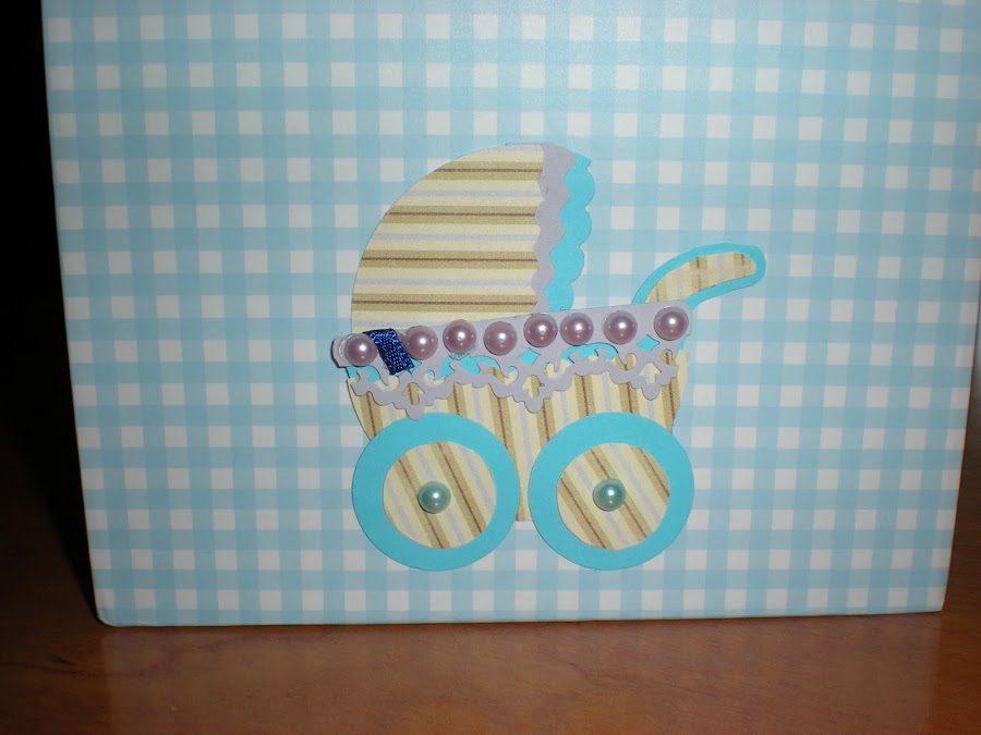 Otro lateral es un carrito de bebe confeccionado a mano.. todo a tijera con superposición de capas, para decorarlo he puesto un camino de perlitas y un pedazo de cinta en el capazo y unas perlitas en las ruedas,