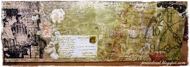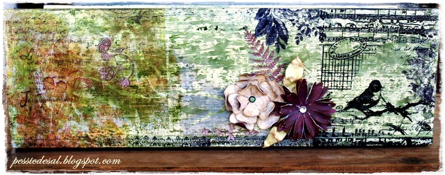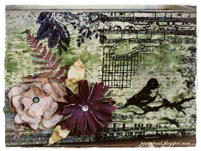 Empiezo por sacar mis selos preferidos, los más grandes para ver cómo puedo hacer para estamparlos y donde....así empiezo y ya es un no parar: sellos, embossing en negro,pintura en spray "color wash" con la que juego antes de secarse,estampando bolsas de plástico y papel arrugado para hacer dibujos, découpage, rubbons, flores en 3D...un poco de todo y mezclando colores pero armoniosos con el fondo, de color verde predominante, cosa queme sorprende porque no es uno de mis favoritos...pero me apetecía.