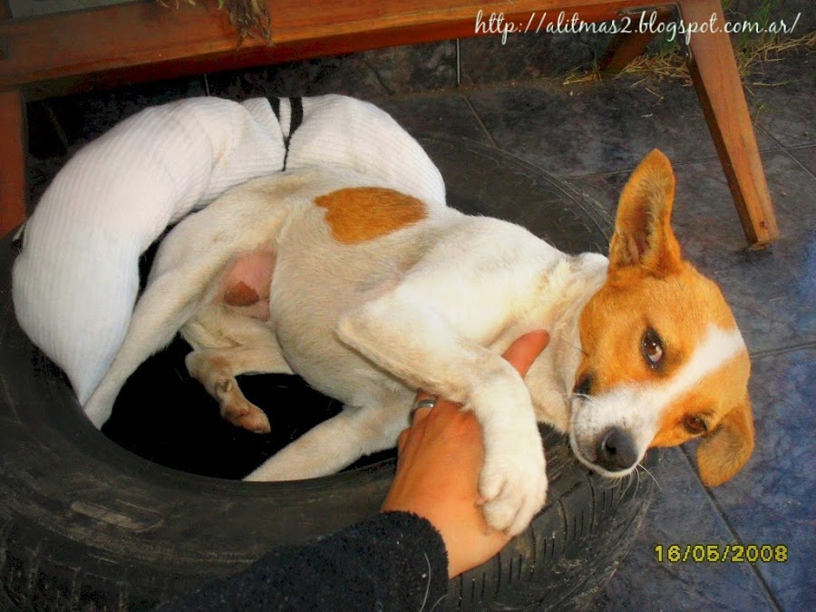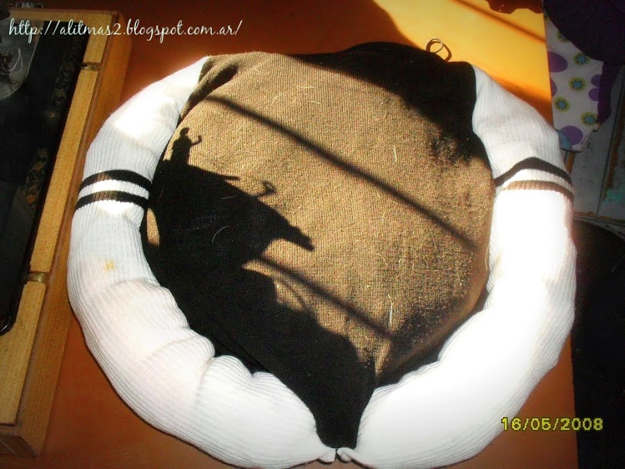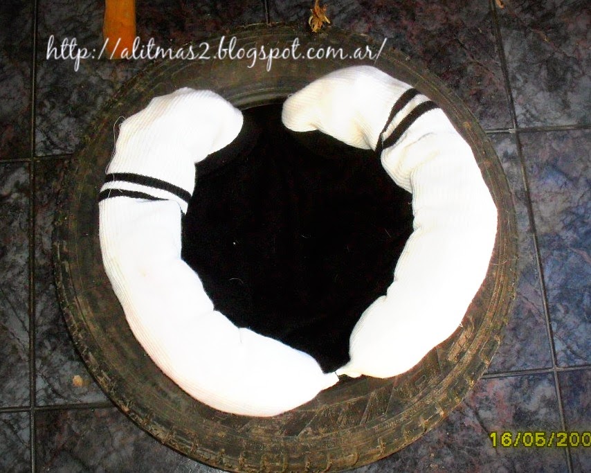 Es una polera vieja que nunca me gusto mucho, pero era abrigada, le cosí los brazos al costado del cuerpo cuidando que al final las puntas de las mangas se unan entre si y así se logra la terminación redonda. No necesite mucho detalle del derecho o el revés porque ya sabia que era para poner dentro del neumático (reciclado x 3 ;) )