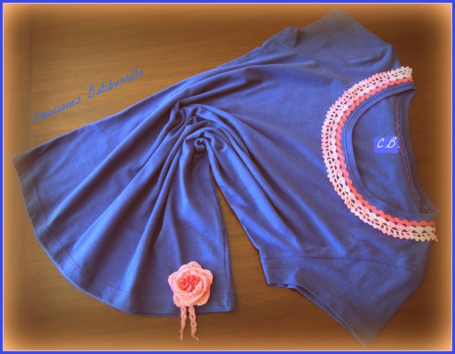 Una vez finalizada, la cosemos con unas puntadas del mismo color de la puntilla todo alrededor, procurando que la unión nos coincida con una costura de la camiseta.