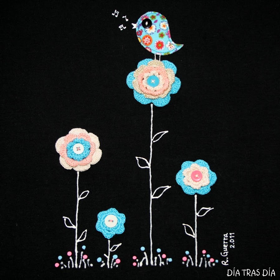DETALLE DE PÁJARO DE TELA DETALLE DE FLORES DE CROCHET