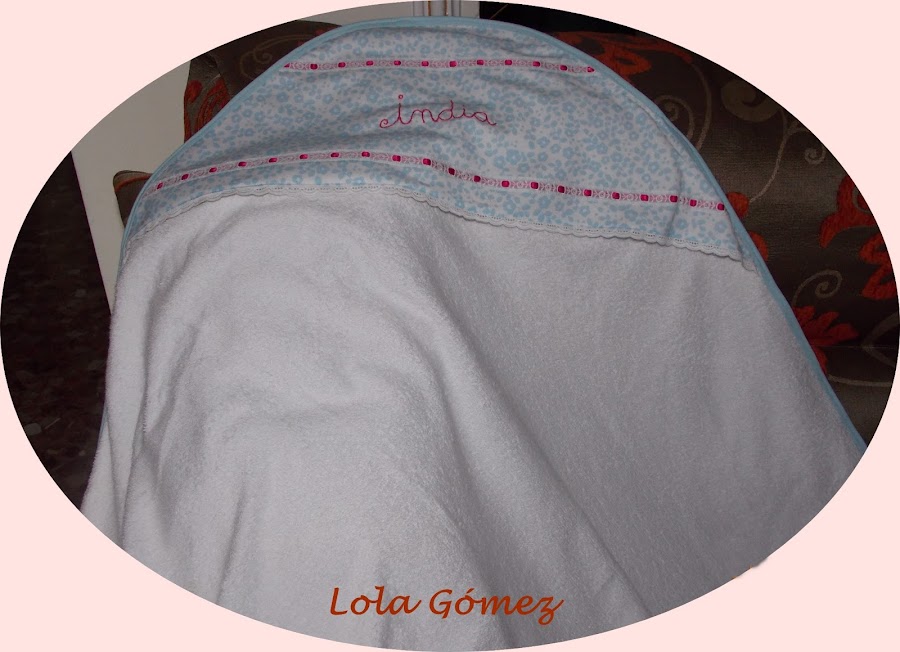 La toalla, con su capucha y personalizada con su nombre que está bordado con puntada atrás.