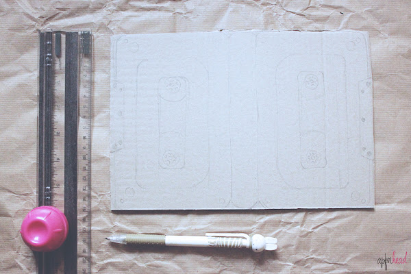 Se me ocurrió como estructura realizar una cinta de cassette en forma de carpeta donde meter todos los complementos de este correo. Tenía cartón de una caja y con él hice la estructura. Con gouache pinté el diseño de la cinta y con un rotulador repasé los bordes. Para el interior tenía un papel con notas musicales y forré algunas zonas con él.