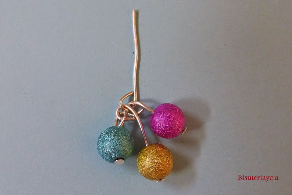 A continuación enfilaremos una bolita en cada uno de los bastones para pendientes, y después uniremos estos a una bastón central.