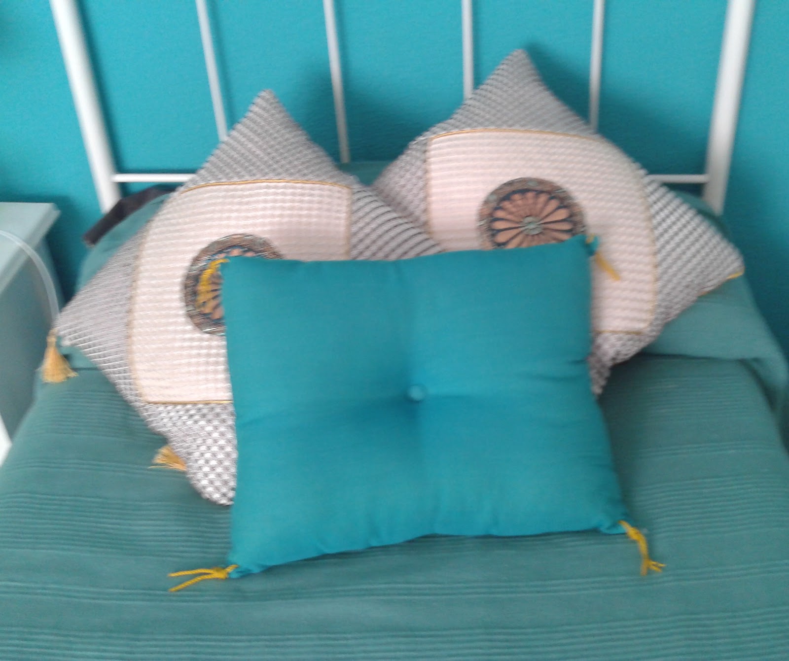 El de lana es un "invento" de mi hermana , pues empezó a hacerlo a modo de bufanda y al final lo he reciclado como cojín , ya que le va de perlas con los colores de su dormitorio.
