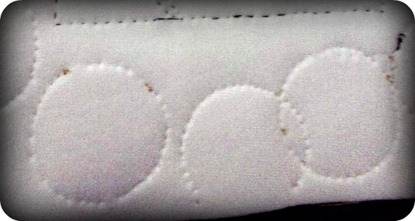 Como lo voy a acolchar , con un boli de estos que con calor se borra la tinta , marco el motivo que he pensado podría irle bien y que fuera diferente a lo que habitualmente se hace . Con una plantilla que he recortado en un trozo de cartón , para que sean todos del mismo tamaño , marco la circunferencia por toda la superficie , respetando el motivo central , sin seguir ningún orden preestablecido .