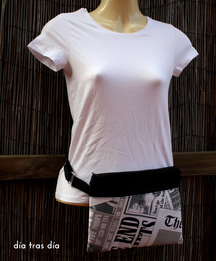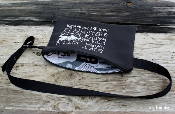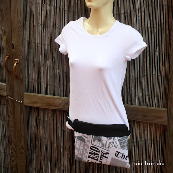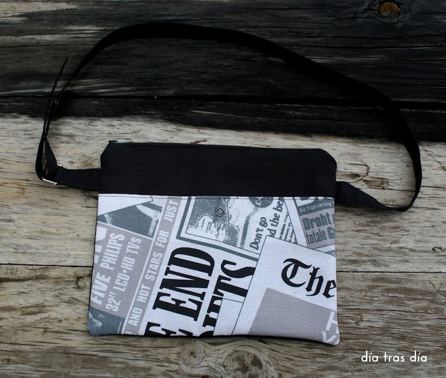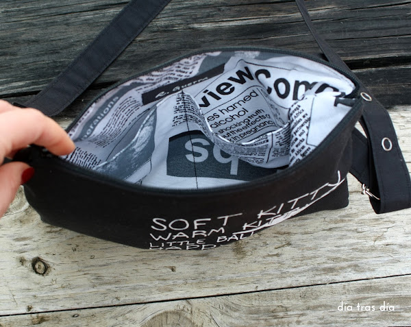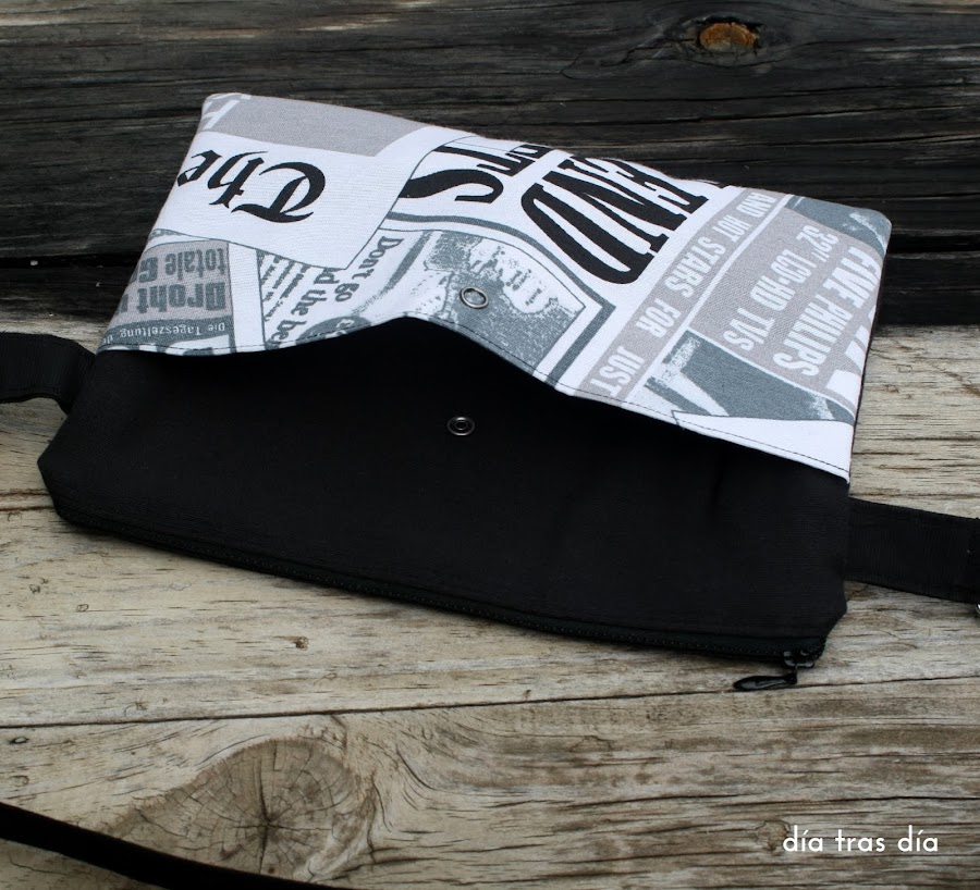 En la parte trasera y en el interior utilicé una tela con estampado de periódico, que la tenía guardada desde hacía tiempo y aún no me había animado a estrenarla: