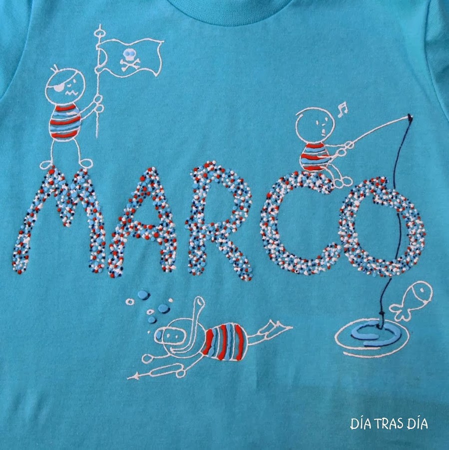 En concreto me pidieron el modelo en el que los monigotes van de temática marinera. Hice una así para Celia, la artista que se esconde detrás de Punt a Punt, hace un par de veranos para su hijo Marc. Os refresco la memoria con la camiseta de Marc: