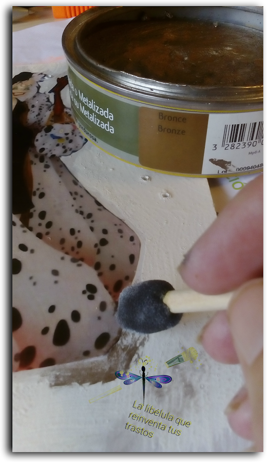 Para integrar mejor el decoupage, le aplico a todo el contorno cera efecto metalizado color bronce.
