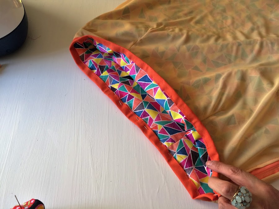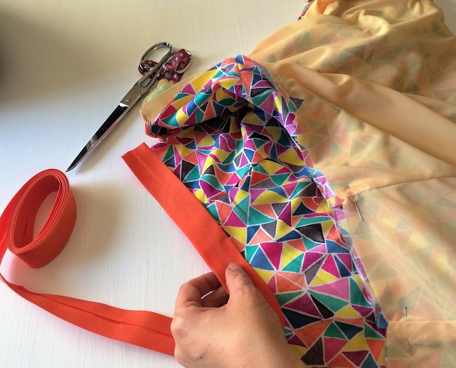 Con el bies en el color elegido sera la forma de unión del forro y la falda, lo ponemos con alfileres en la parte superior de la falda sujetando con ello el forro y la falda, para pasar un hilván que no nos quede nada suelto y pasar a la maquina.